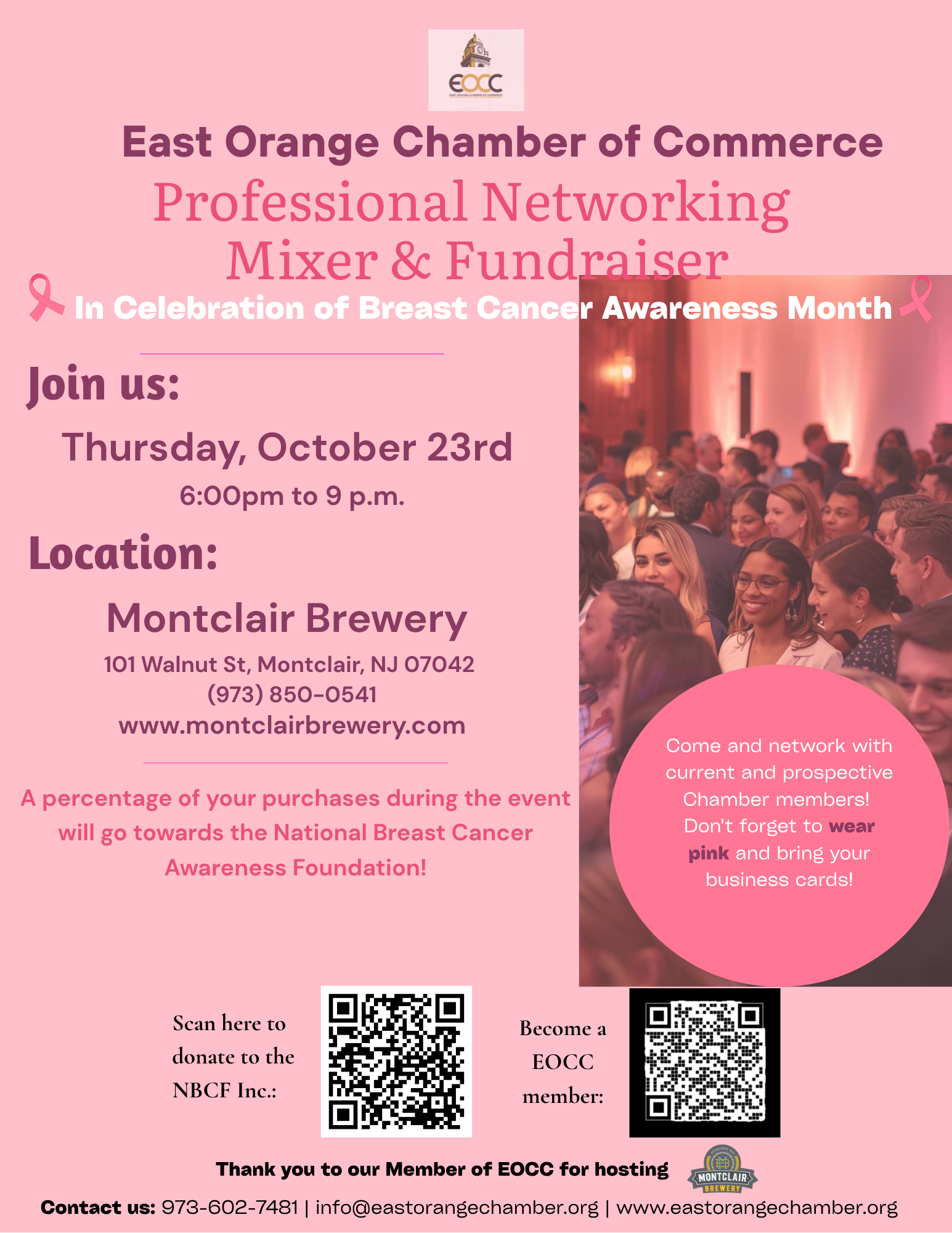 Networking Mixer – Montclair Brewery 101 Walnut st, Montclair NJ 07040 — Breast Cancer Awareness – A percentage of your purchase during the evening will be donate to the National Breast Cancer Awareness Foundation.